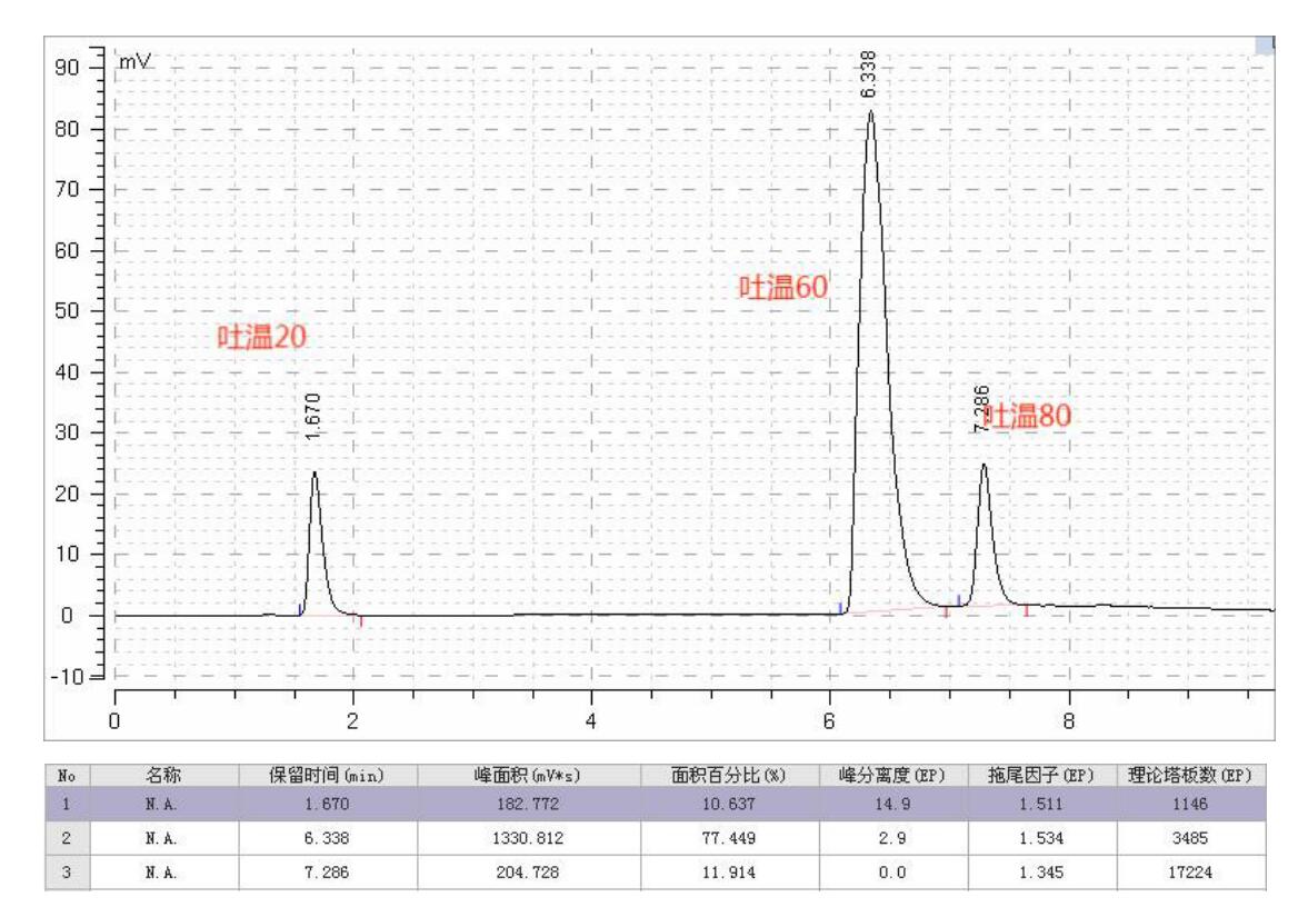 說(shuō)明:Mercury Tween 吐溫專(zhuān)用色譜柱可實(shí)現(xiàn)吐溫 20,吐溫 60 和吐溫 80 的一次性分析,峰形良好。