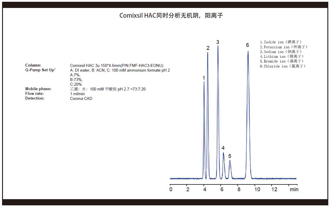 Comixsil HAC分離氨基糖苷類的鏈霉素與雙氫鏈霉素 Comixsil HAC分析8種氨基糖苷物質(zhì) Comixsil HAC分離11種核酸堿基與核苷(MS匹配) Comixsil HAC 液相方法分離鈣與鋅離子 Comixsil HAC同時分析鋅鈣銅等金屬離子及相應(yīng)的陰離子